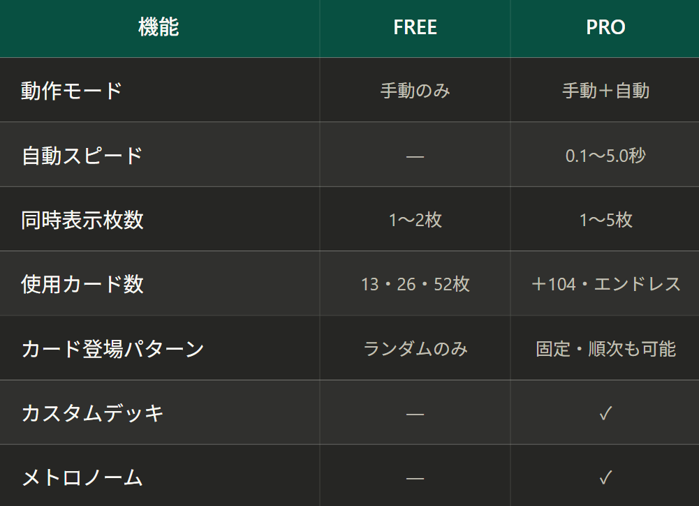 PRO版ではカードが自動で進む自動モードとメトロノーム音が利用できます。